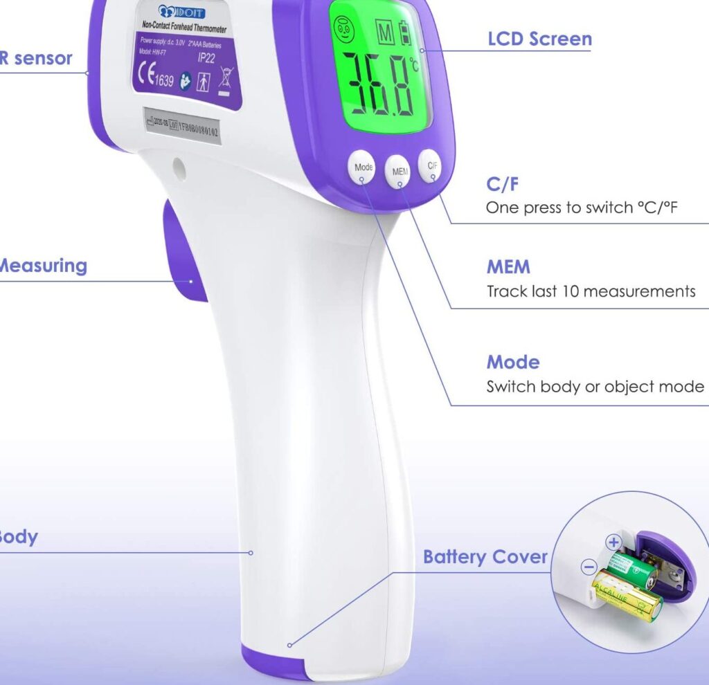 - Termómetro Infrarrojo sin Contacto Digital para Niños y Adultos con Alarma de Fiebre y Memoria de 20 Lecturas